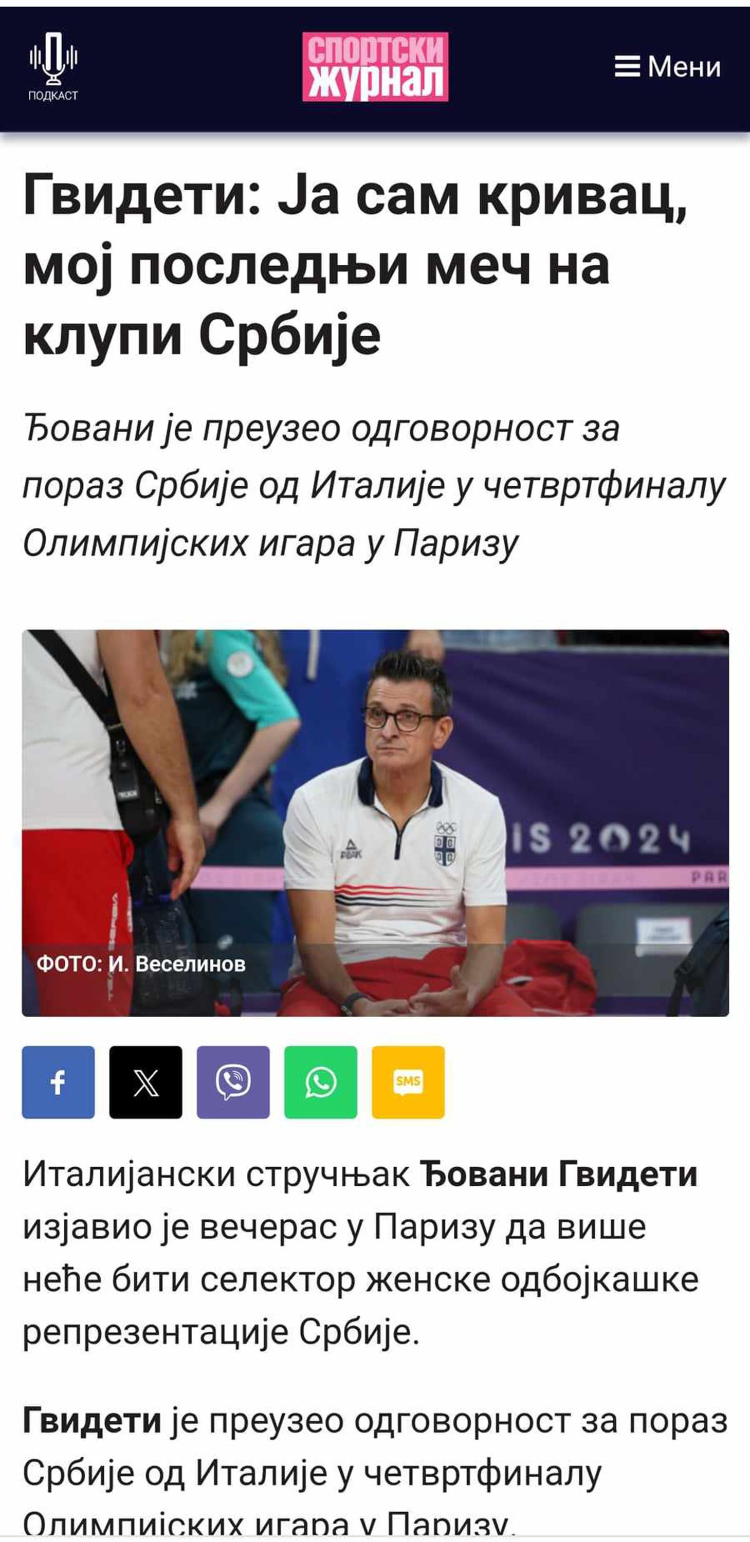 Гуидети пое отговорността за загубата на Сърбия от Италия на четвъртфиналите на Олимпийските игри в Париж. Женският волейболен отбор на Сърбия не успя да се класира за полуфиналите на Олимпийските игри, след като загуби от Италия с 3:0 (26:24, 25:20, 25:20).