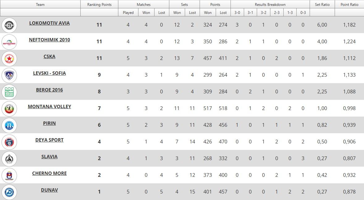 Пловдивският Локомотив Авиа постигна четвърти пореден успех в Суперлигата, след като се наложи убедително с 3:0 (25:19, 25:15, 25:17) над Дунав (Русе) в среща от петия кръг. Триумфът в собствената зала изкачи пловдивчани на върха във временното класиране с 11 точки – равни с Нефтохимик 2010 и ЦСКА, като бургазлии също нямат поражение от началото на сезона.