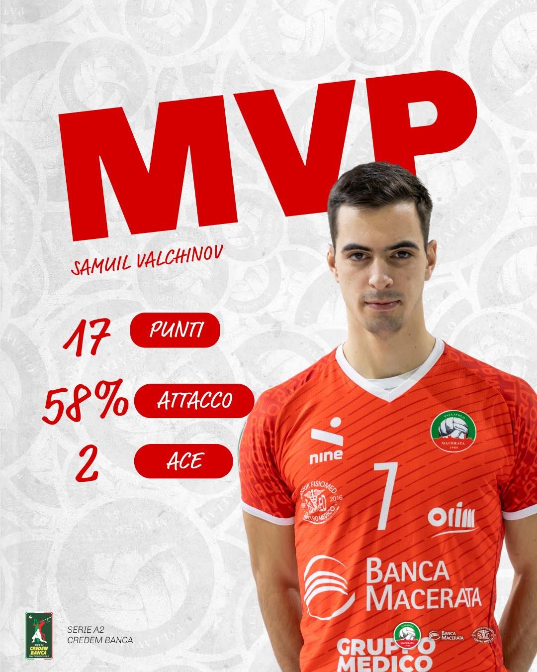 Националът Самуил Вълчинов стана MVP при първата победа на неговата Banca Macerata Fisiomed над Emma Villas Siena с 3-0 (25-21, 29-27, 29-27) в петият кръг от шампионата на Серия А2 Credem Banca. Бившият италиански национал Габриеле Нели от тима на госите не влезе в игра. Най-оспорван бе третия гейм, който продължи 40 минути и финишира при резултата 29:27. Сами Вълчинов завърши със 17 точки (в т.ч 2 аса и 1 блок), като имаше 38 процента позитивно посрещане и 58 в атака.