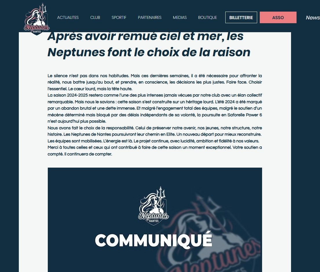 Despite its sporting successes, the club emphasized that the decision is an "act of responsibility" and is aimed at preserving the club as an institution, association, and academy. With 450 young athletes and an academy with traditions dating back to 1968, "Neptunes Nantes" chose to sacrifice its elite status to ensure its long-term survival and the development of women's volleyball in the region.