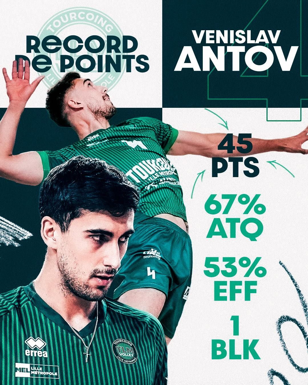 In the aforementioned away game, Antov literally "carried the team on his back" – he attacked 66 times, scoring 44 points from those, and added one block for a total of45 points. His efficiency –67% in attack, and only 5 direct errors – turned the match into an example of individual dominance unseen in France.