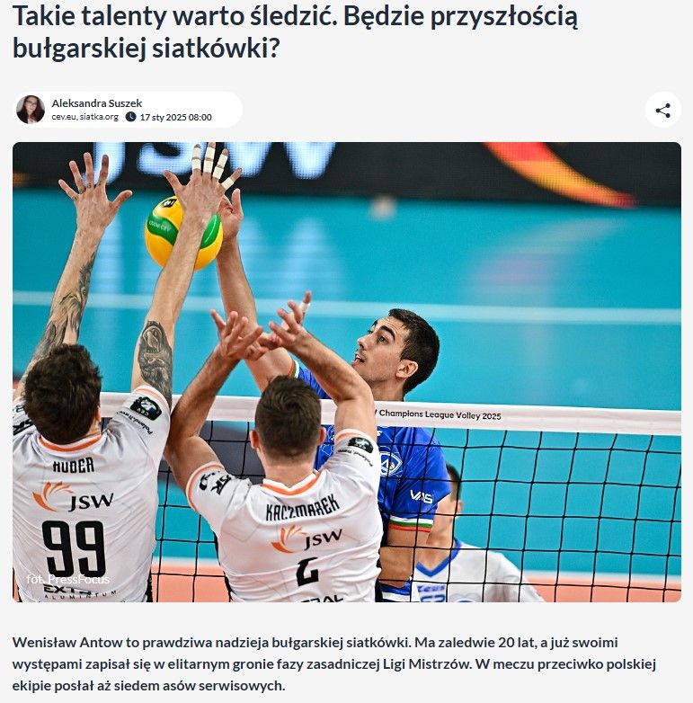Even before his transfer to France, Antov had already been in the spotlight. Last season, Polish media paid serious attention to his performance with the Levski team in the Champions League group stage. The strongest reviews came after the match against Jastrzębski, which 'the Blues' lost by2:3 sets, but the young opposite hitter had an exceptionally strong individual match, which impressed analysts in Poland.