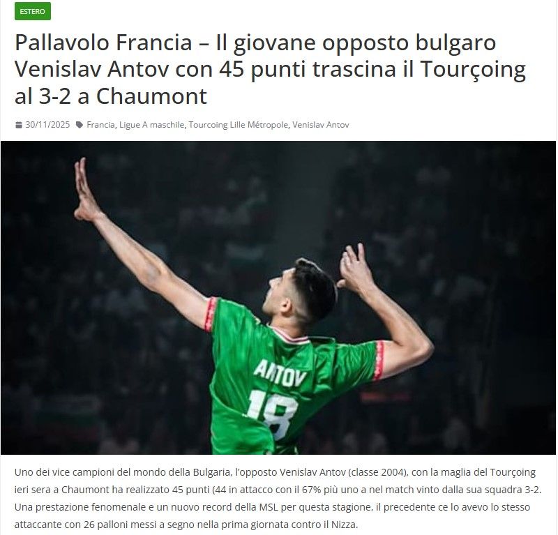 Antov's phenomenal performance did not go unnoticed outside of France. The Italianivolleymagazine.ithighlighted that the Bulgarian opposite hitter – "one of the world's vice-champions, born in 2004" – recorded 45 points (44 in attack with 67%) in the won match against3:2match against Chaumont, having broken the league's record for this season. The publication recalls that the previous record also belonged to him – 26 points in the first round against Nice.